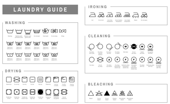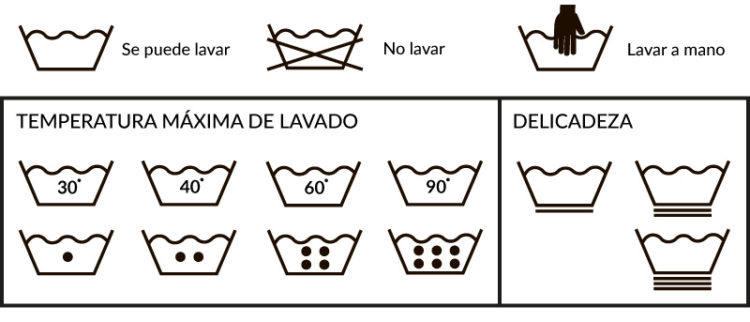 Los símbolos de lavado son los más comunes. Indican si la prenda puede lavarse en lavadora, a mano o si requiere un tratamiento delicado.